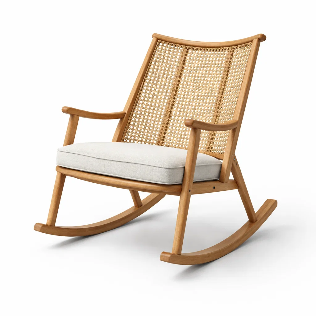 Bois Fauteuil à bascule avec Dossier en Rotin et Coussin en Lin Beige