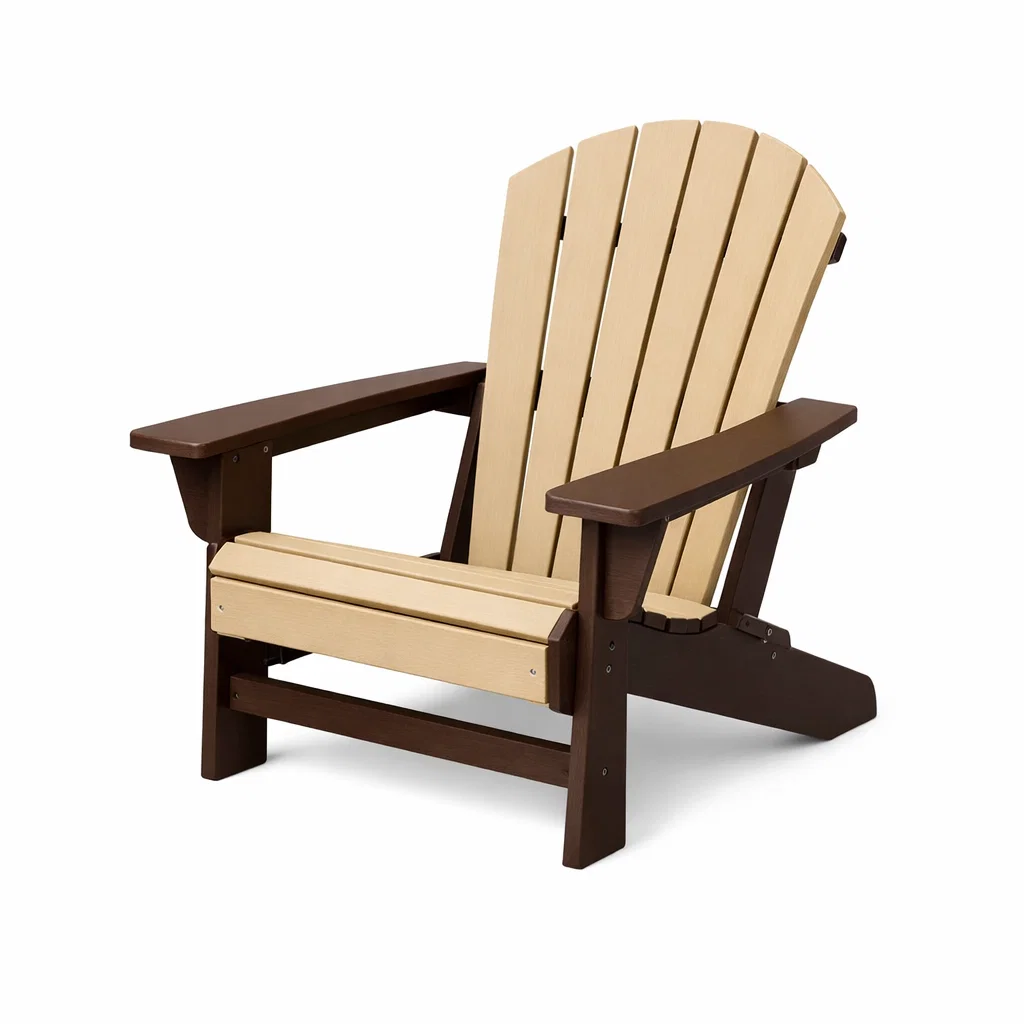 Chaise de style Adirondack fabriquée en bois composite, résistante aux intempéries.