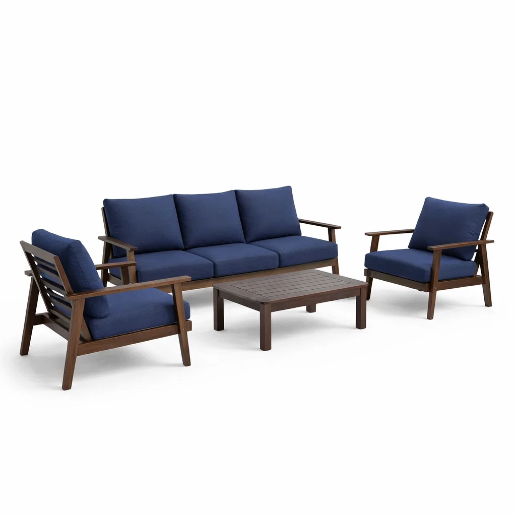 Ensemble de mobilier extérieur composé d'un canapé 3 places, deux fauteuils et une table basse. La structure est en bois d'acacia avec des coussins rembourrés de mousse et recouverts de tissu en polyester. Dimensions : canapé 190 x 78 x 80 cm, fauteuil 80 x 78 x 80 cm, table 100 x 50 x 40 cm. Housses de coussin amovibles et lavables. Nettoyer le bois avec un chiffon humide.