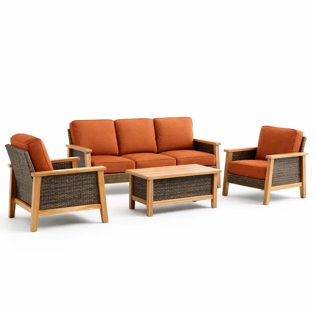 Structure en bois d'acacia avec résine tressée. Coussins en polyester avec housses amovibles, résistants aux UV et à l'eau.