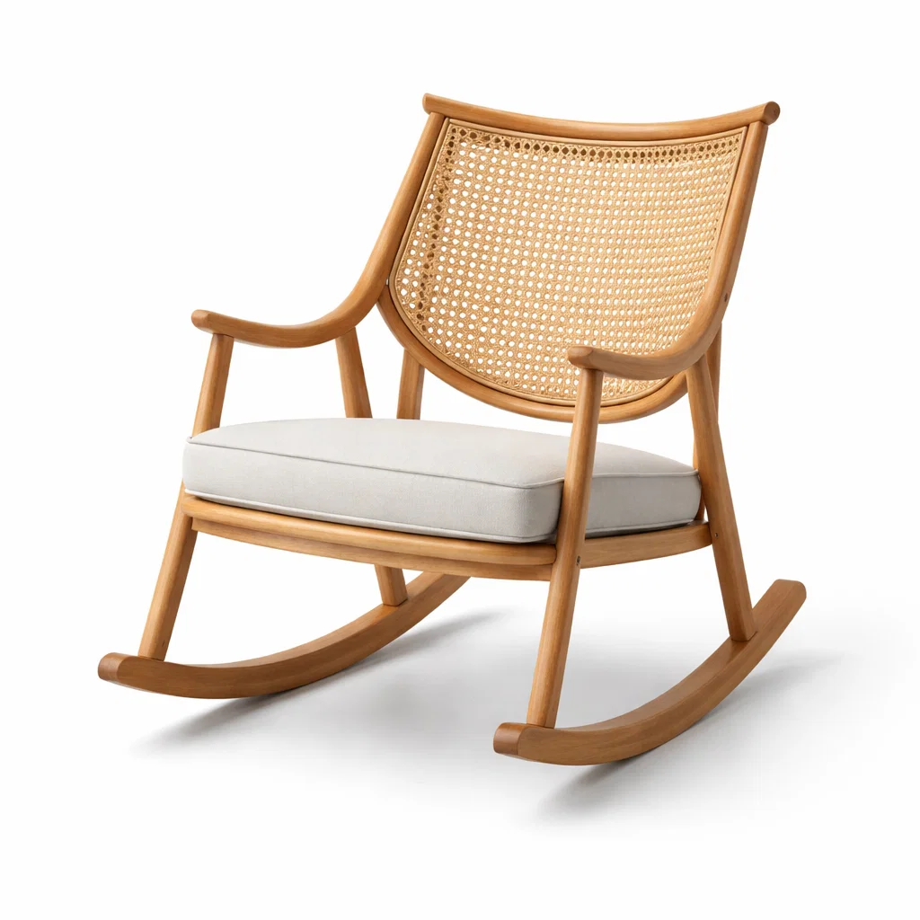 Matériaux: Structure en bois, Dossier en rotin, Coussin en lin