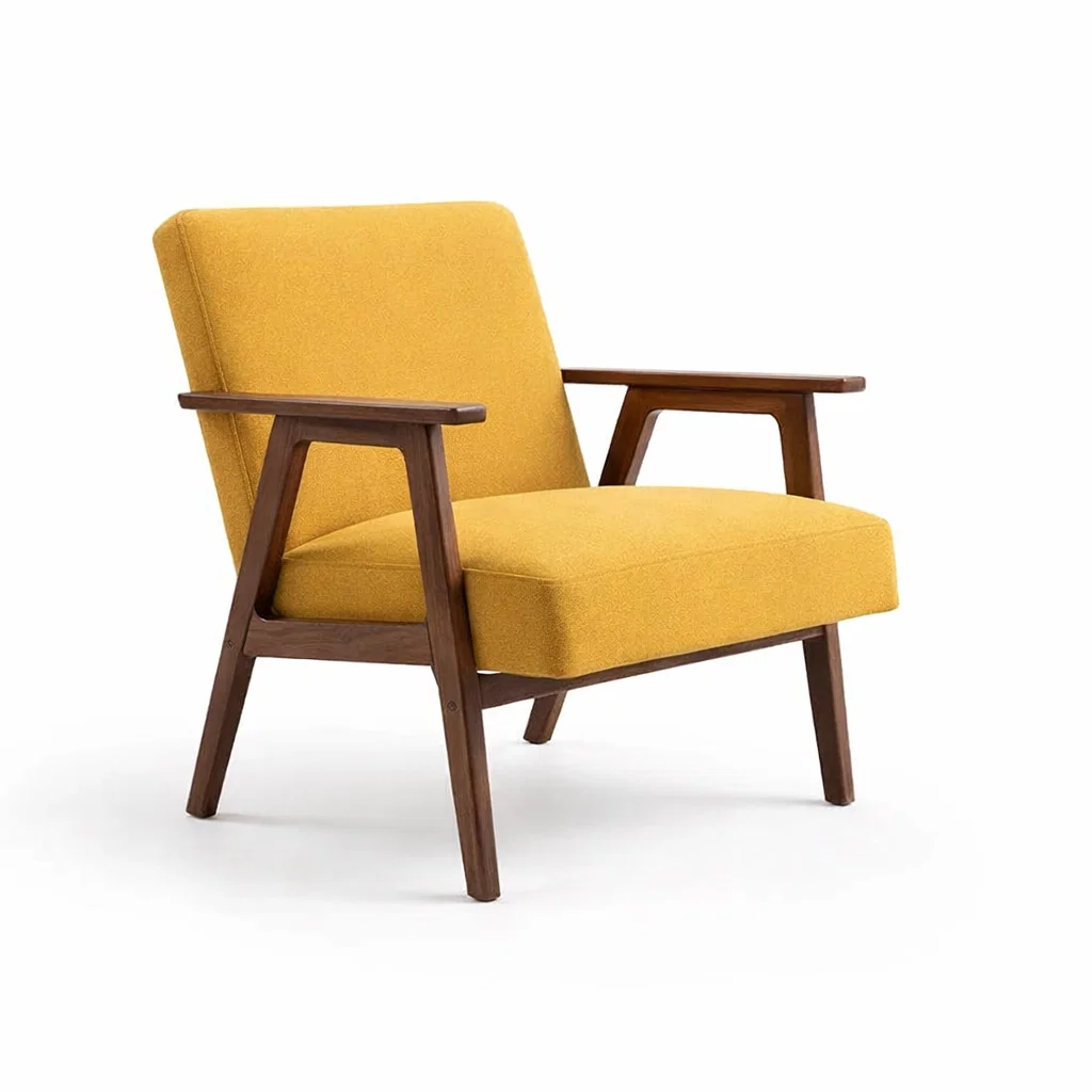 Ce fauteuil est construit avec un cadre en bois massif et est recouvert d'un tissu en polyester jaune. Le rembourrage est en mousse polyuréthane.