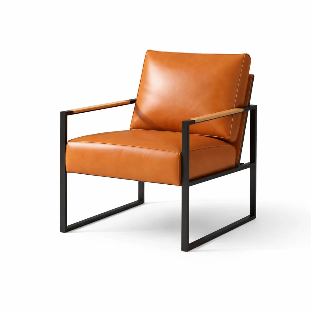 Cuir Synthétique Orange Fauteuil avec Structure Métal et Accoudoirs en Bois