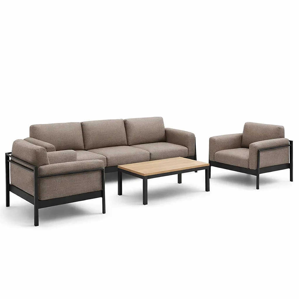 Cadre en métal avec finition durable. Le canapé et les fauteuils sont recouverts de tissu en polyester résistant. La table basse est fabriquée en chêne solide. Dimensions du canapé: 200 cm x 85 cm x 75 cm. Dimensions des fauteuils: 85 cm x 80 cm x 75 cm. Dimensions de la table basse: 100 cm x 60 cm x 40 cm.