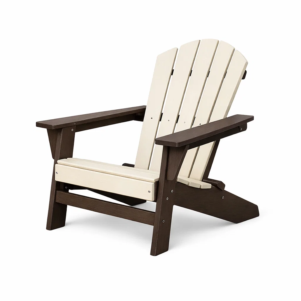 Chaise Adirondack fabriquée en polyéthylène haute densité, résistante aux intempéries. Dimensions : 90 cm de longueur, 80 cm de largeur et 95 cm de hauteur. Poids : 15 kg, avec une combinaison de couleurs blanche et brune. Conception avec des accoudoirs larges et une structure robuste. Nettoyage avec un chiffon humide.