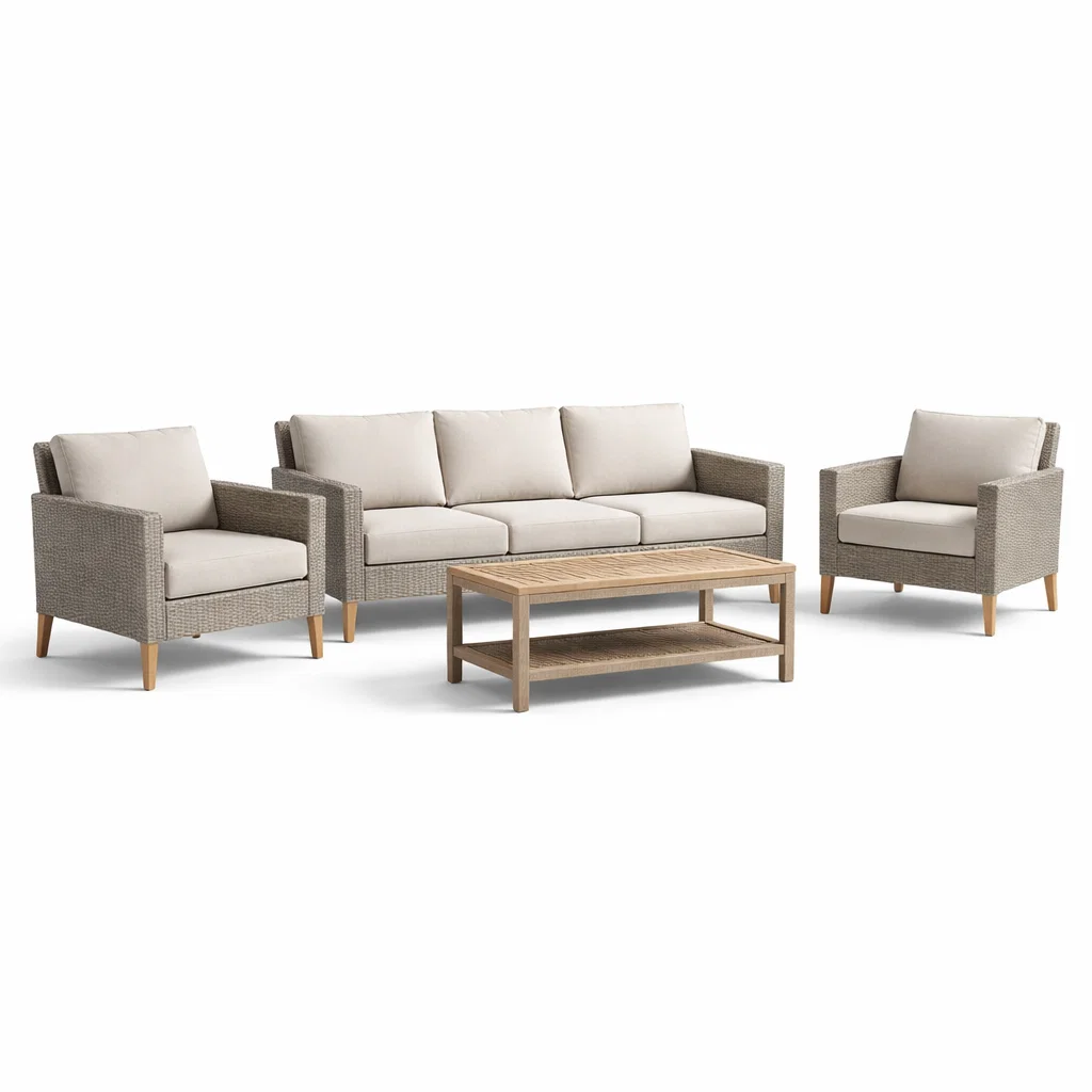 Ce set de mobilier de jardin comprend un canapé trois places, deux fauteuils et une table basse. La structure est en rotin synthétique avec des pieds en bois. Les coussins sont rembourrés de mousse pour le confort. Dimensions: Canapé trois places: Longueur 200 cm, Profondeur 75 cm, Hauteur 85 cm; Fauteuil: Longueur 80 cm, Profondeur 75 cm, Hauteur 85 cm; Table: Longueur 100 cm, Largeur 60 cm, Hauteur 40 cm.