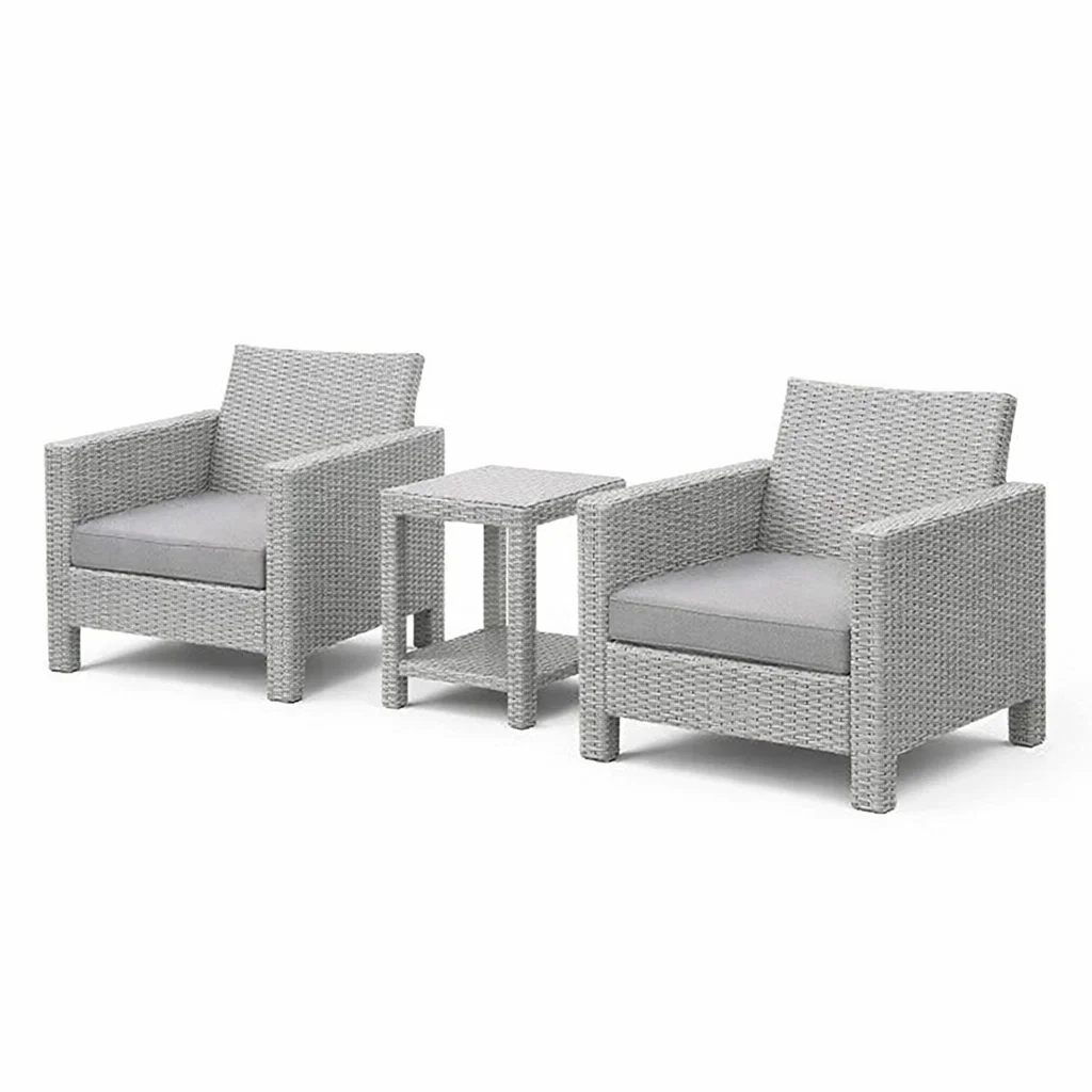 Ensemble composé de : 2 fauteuils en rotin synthétique avec coussins en polyester rembourrés de mousse grise et 1 table.