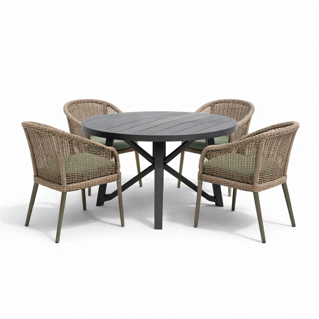 - Chaises : Structure en rotin synthétique et aluminium avec coussins en polyester