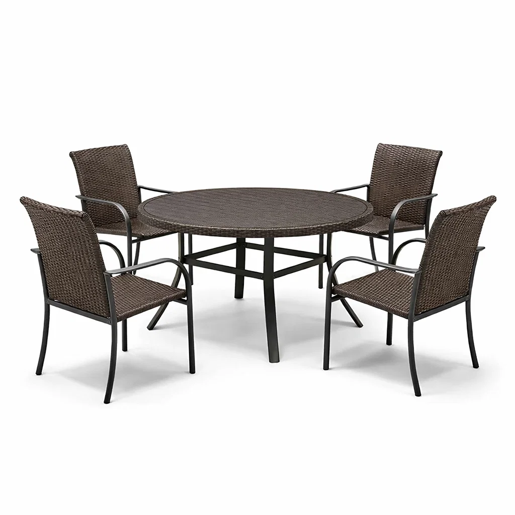 Ce set comprend une table et quatre chaises en rotin synthétique et en métal.