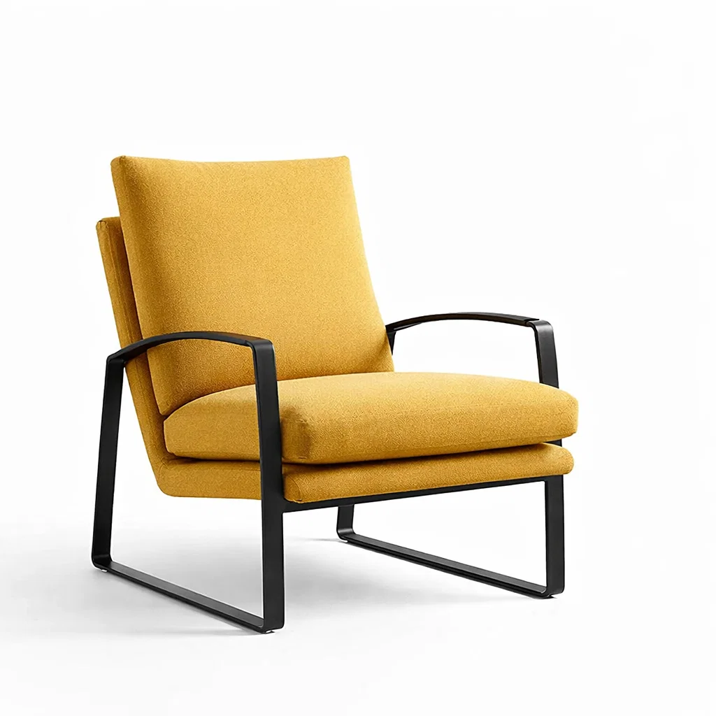 Ce fauteuil est doté d'un revêtement en tissu jaune et d'une structure en métal noir. Les dimensions sont de 75 cm de longueur, 80 cm de largeur et 85 cm de hauteur, avec une hauteur d'assise de 45 cm. Le poids total du fauteuil est de 12 kg et il peut supporter jusqu'à 120 kg. Les accoudoirs sont en métal noir. Pour l'entretien, nettoyez avec un chiffon humide et évitez les produits abrasifs.