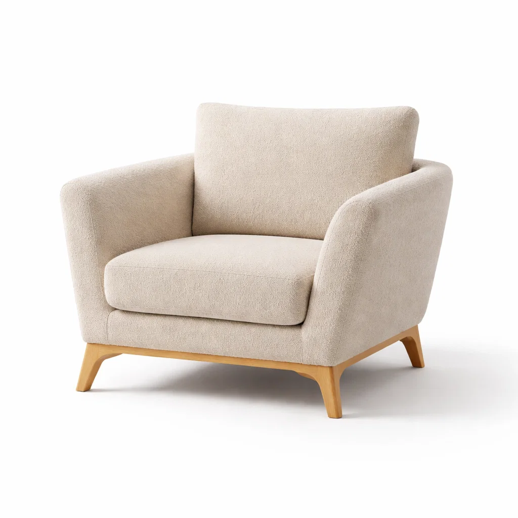 Le fauteuil est revêtu d'un tissu en polyester beige et repose sur des pieds en bois massif. Les dimensions de ce fauteuil sont de 80 cm de hauteur, 90 cm de largeur, et 85 cm de profondeur, avec une hauteur d'assise de 45 cm. La capacité de charge maximale est de 120 kg. Pour l'entretien, nettoyez avec un chiffon humide et évitez l'exposition directe au soleil.